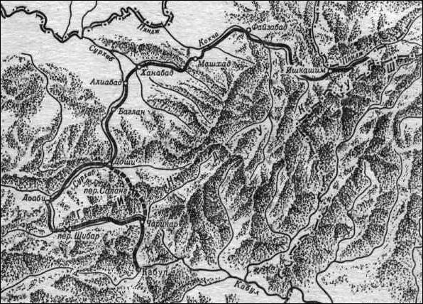 Совершив затем автопутешествие через Бадахшан по долинам реки Кокчи и ее притоков, мимо древних высокогорных земледельческих оазисов Файзабада, Джурма, Бахарака, экспедиция попадает наконец в знаменитый Ваханский коридор. Это узкая полоска афганской территории (шириной всего от 16 до 68 км) между Советским Таджикистаном на севере, |ШР на востоке, Пакистаном и Индией на юге. Граница с СССР здесь проходит по Пянджу, а затем по одному из его истоков ― реке Памир (автор всюду Пяндж именует Амударьей или ее древнегреческим названием Оксус).