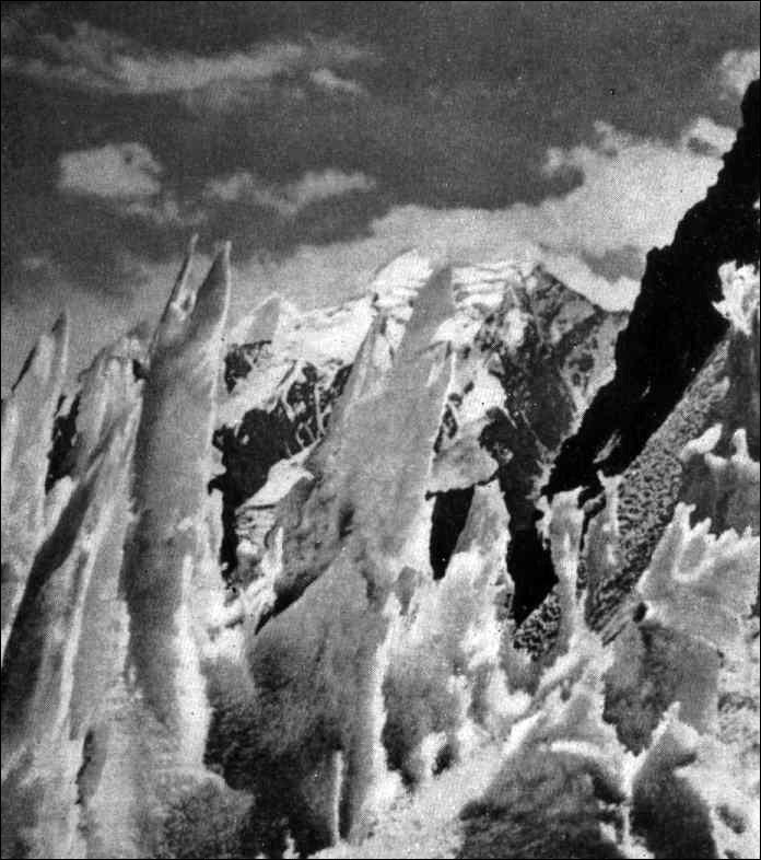35. Изрезанный скально-ледовый гребень ведет от лагеря I (5400 м) на вершину Арганда (7038 м)