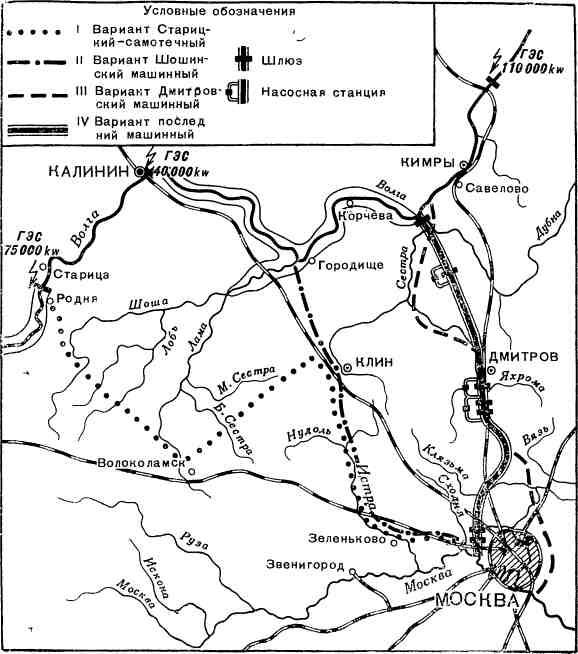 Мы разработали вначале так называемый Шошинский вариант (с началом канала от устья р. Шоша) с механической подачей воды и лестницами шлюзов. Дальнейшая же работа над проектом, тщательное изучение местности — а это было нелегко, учитывая полное бездорожье, болота или глухие леса в этом районе, — обусловили появление более экономичного Дмитровского варианта. Канал начинался на Волге у дер. Иваньково, затем шел по окраине Дмитрова, мимо Яхромы, Икши с выходом в Москву-реку также у с. Тушино. Протяженность его по проекту составляла 128 км, объем земляных работ — 151 млн. куб. м, глубина выемок на канале предполагалась не более 12 м (и лишь на небольшом участке до 30 м). 20 мая 1932 г. в Московском городском комитете партии состоялось широкое совещание по рассмотрению представленных вариантов канала: Старицкого, Шошинского и Дмитровского. Все три проекта (см. схему) были подвергнуты самому детальному обсуждению. Подавляющее большинство высказалось за Дмитровский вариант.