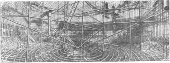 По мере установки на место поясов черновой формы монтировался внутренний металлический каркас из круглого арматурного железа. Стык арматуры делался внахлестку. Одновременно устанавливалась опалубка внутренней стороны оболочки из строительной фанеры по обычным дощатым кружалам.