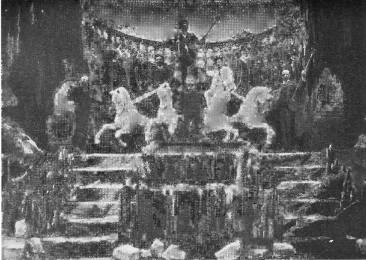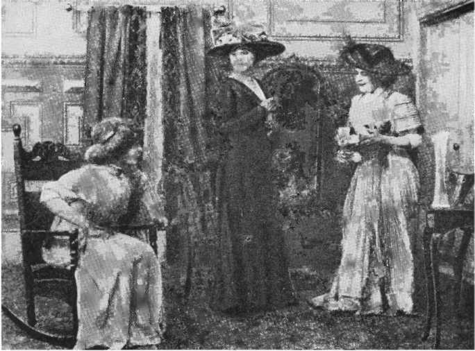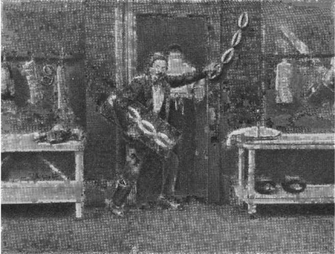 Мы видим, что в 1909 г. монтаж — явление исключительное. Сиену длиной 300 метров снимают подряд на одну катушку. Разумеется, и речи пет о том, чтобы снять одну сцену два раза — это было бы порчей дорогого негатива.