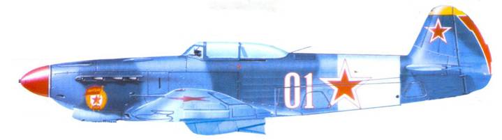 Трудно определить к какой модификации «девятки» принадлежит эта машина. Вероятно это Як-9Т, в пользу чего свидетельствует ствол пушки, выступающий из кока винта.