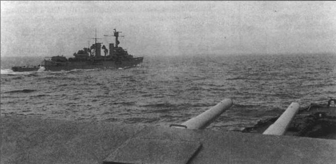 Снимок из той же серии, что и предыдущий — учения 88-мм зенитчиков крейсера «Кенигсберг». Ниже среднего орудия башни «В» главного калибра сделана надпись «Lutzov» в память Адольфа барона фон Лютцова, знаменитого прусского генера- ла-конника эпохи Наполеоновских войн. Имя «Лютцов» также носил флагманский корабль адмирала Франца фон Хиппера в Ютландском сражении 31 мая 1916 г. На двух других башнях главного калибра крейсера «Кенигсберг» также были закреплены поминальные таблички.