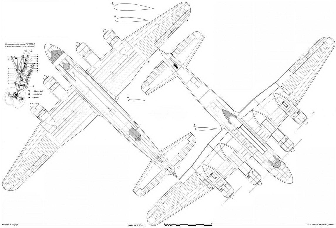 На рубеже 1935 и 1936 гг. чиновникам из ведомства Геринга волей-неволей пришлось взглянуть в лицо фактам. Если на внутренних линиях конкуренцию Ju 52/3m еще можно было устранить административными методами, то на международных маршрутах «Дугласы» очень скоро могли вытеснить стремительно устаревавшие «Юнкерсы». Немцы оказались в положении догоняющего, и теперь им приходилось действовать максимально быстро. Уже в феврале 1936 г. требования к новому четырехмоторному пассажирскому самолету были разосланы авиастроителям. Вероятно, «Фокке- Вульф» неофициально заполучил этот документ гораздо раньше — судя поданным из фирменного архива, предварительное проектирование началось еще 19 января 1936 г., и в тот же день были зарезервированы заводские номера для двух прототипов будущего «Кондора».