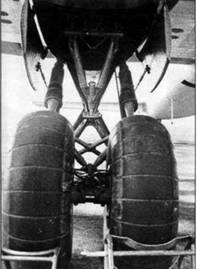 Шасси трехопорное с хвостовой опорой. Основные опоры убираются против полета в мотогондолы внутренних двигателей. Стойки основных опор рычажного типа, имеют ферменную конструкцию и оснащены двумя телескопическими амортизаторами каждая. На оси основной опоры установлены два колеса размером 1100x375 мм с двухсторонними тормозами колодочного типа. Одноколесная хвостовая опора убирается против полета в хвостовую часть фюзеляжа. При этом колесо частично остается в потоке. Размер хвостового колеса — 685x250 мм.