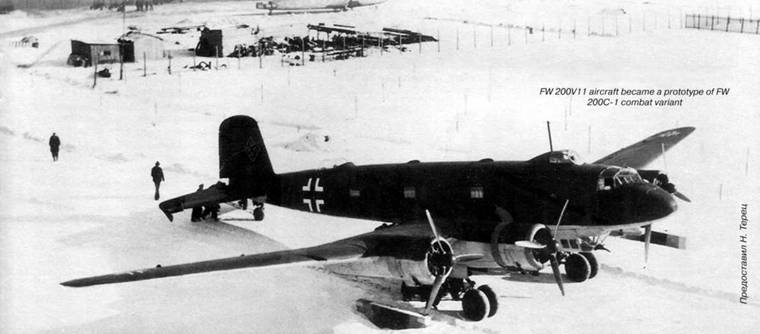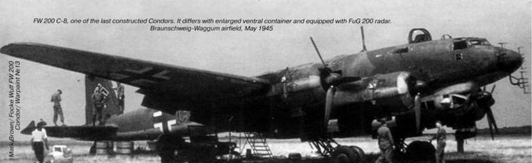 Однако еще в августе 1939 г. FW 200V2 поступил в распоряжение испытательного центра в Рехлине. Там машину оборудовали аэрофотоаппаратами и передали в распоряжение «команды Ровеля» — специальной части, занимавшейся дальними разведывательными полетами. 29 августа в Рехлин прибыл еще один люфтганзовский «Кондор» — «Нордмарк», также поставленный на переоборудование в фоторазведчик. Одновременно на заводе «Фокке-Вульф» начали переделку практически готового прототипа серии FW 200В — FW 200V4. Самолет получил новое обозначение FW 200V10, а помимо двух размещенных в фюзеляже перед входной дверью аэрофотоаппаратов Rb 50/30 на нем установили и оборонительное вооружение: пять 7,92-мм пулеметов MG 15 (один в верхней подвижной установке, два в окнах по бортам фюзеляжа и два в небольшой подфюзеляжной гондоле). Оснастили его и усиленным шасси со сдвоенными колесами, которое затем стало типовым для «Кондоров». Карьера FW 200V10 оказалась короткой. 23 ноября 1939 г. ему предстояло отправиться в свой первый разведывательный полет, целью которого была база британского флота Скапа-Флоу. При взлете с аэродрома Евер у «Кондора» отказали оба правых двигателя, и машина, неуспев набрать высоту, разбилась. Экипаж отделался лишь царапинами и ушибами.