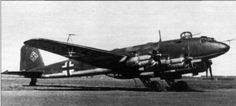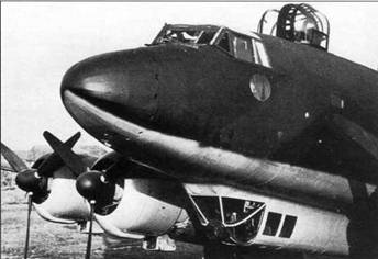 На самолете имеются следующие стрелковые точки. Передняя нижняя — носовой отсек подфюзеляжной гондолы с пушкой, закрепленной на раме остекления. Запас снарядов на пушку 195 шт. Огонь из пушки ведет штурман- бомбардир. На некоторых вариантах самолета вместо пушки размещался пулемет MG 15 в линзовой установке. Задняя нижняя стрелковая точка — хвостовой отсек подфюзеляжной гондолы с пулеметом MG 15. Боезапас — 1125 патронов. Пулемет закреплен на трубе, установленной по хорде вращающегося в вертикальной плоскости кольца. Огонь ведет бортмеханик. Экран этой установки выполнен в виде прозрачного конуса с вырезанным сектором под пулемет. В походном положении экран поворачивается вместе с пулеметом вокруг продольной оси на 180', прикрывая гондолу от задувания. Передняя верхняя стрелковая точка — турельная башня, вращающаяся в горизонтальной плоскости на 360“. Оснащена пулеметом с боезапасом 2250 патронов. Стреляет из этого пулемета радист. В боевой обстановке телеграфный ключ радиостанции переносится наверх, и радист может работать на ключе, находясь в башне. Настройка радиостанции при этом невозможна. На самолетах поздних серий в этой башне установлен пулемет MG 131 калибром 13 мм с боезапасом 1000 патронов. Задняя верхняя стрелковая точка — пулеметная турель, закрытая в походном положении прозрачным колпаком, задняя часть которого состоит из трех секторов. Запас патронов на пулемет 1125 шт. Огонь ведет воздушный стрелок. Перед стрельбой он, вращая ручку, сдвигает колпак турели вперед, при этом сектора поворачиваются вверх и складываются. Еще два пулемета располагаются в люках по левому и правому бортам задней части фюзеляжа. Суммарный боезапас — 1650 патронов. Стрельбу из них ведут один или два воздушных стрелка. Пулеметы установлены на кронштейнах, вращающихся на вертикальных стойках. В походном положении пулеметы убираются внутрь фюзеляжа, а люки закрываются остекленными щитками.