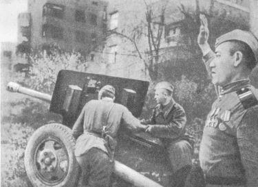 Расчет гвардии младшего сержанта А, Н. Гуссейнова на одной из улиц Берлина