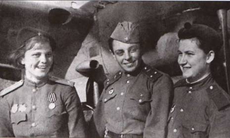 Один из экипажей 125-го ГБАП. Слева направо: штурман Людмила Попова, пилот Ирина Осадзе, стрелок-радист Таисия Панфёрова