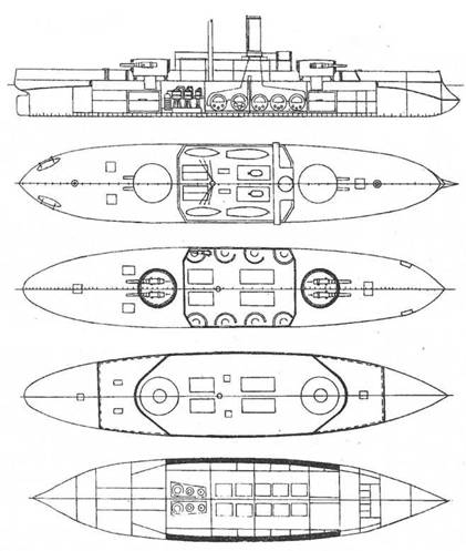Согласно решению Комитета, предстояло изменить образование форштевня, укрепив его горизонтальными ребрами, сделать броневые палубы в оконечностях с их понижением к штевням чуть ниже ватерлинии, устроить 25,4-мм переборки между 152- мм орудиями, поднять башни с расчетом на то, чтобы оси стволов отстояли от плоскости верхней палубы на 1,5 м, расположить носовые торпедные аппараты “под водой” и установить две мачты, подобные тем, что стояли на “Александре II”.