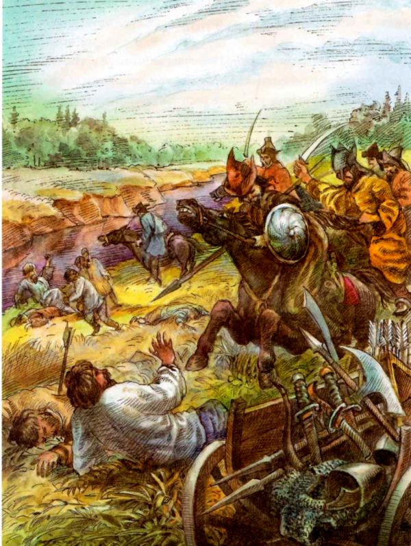 В те годы Русь переживала страшные времена. Русские земли поработили монголо-татарские племена, которые пришли из далеких степей. Эти народы вели кочевую жизнь, любили простор, жили в юртах, а городскую жизнь и труд земледельцев презирали. Дикие орды их повытоптали поля, пожгли города и селения, поубивали их жителей, а тех, кто не успел укрыться в лесах, превратили в рабов.