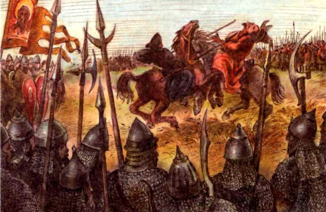И вдруг навстречу татарскому богатырю выехал богатырь русский. Это был инок Александр Пересвет. Он отправился на битву без лат и шлема, в черном монашеском одеянии, с большим копьем в руке.