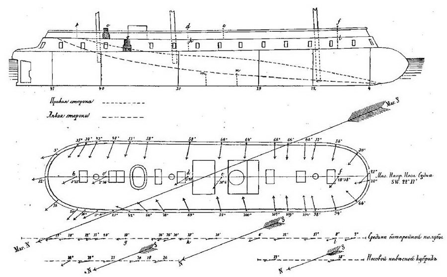 1 — железная фиш-балка; 2-крамбол; 3 — верти кал ьн ые деревянные брусья под броней траверза; 4-броневые плиты траверза; 5-киповые планки; 6-броневые плиты бруствера; 7-понтоны; 8-229-мм нарезное орудие на поворотной платформе; 9-погоны для поворота орудия; 10-железный камбуз; 11-амбразура; 12-верти кальн ые деревянные брусья носового бруствера; 13-банкетка для скорострельного нарезного орудия; 14-палубная решетчатая площадка забортного трапа; 15-забортный трап; 16-каюта командира; 17-люки входа в крюйт-камеры; 1 8-деревянные шлюпбалки; 19-офицерская каюта; 20- фальшборт; 21 — тентовая стойка; 22-труба камбуза; 23-крепление переднего штыря платформы орудия; 24-поперечные брусья платформы плота; 25-вертикальная переборка в корпусе понтона; 26- днище понтона; 27-бочка; 28-боеприпасы в крюйт-камере; 29-настил крюйт-камеры; 30-горизонтальная водоотливная труба; 31-трап в крюйт-камеру; 3 2-вертикальная труба для откачивания воды из отсеков понтонов; 33-6-весельный ял.