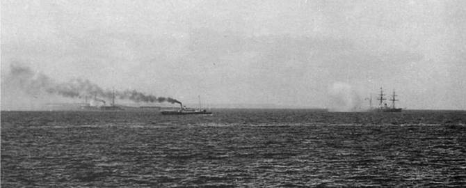 С 1 августа по 4 сентября движение судов на Смирнском рейде состояло в следующем: 24 августа на рейд пришли клипер "Крейсер" из Сиры и французский корвет "Chateau-Renaud" — из портов Сирии; австрийский броненосный корабль "Кустоцца". под флагом контр-адмирала Барри, прибыл на рейд из Сиры; 27 фрегат "Светлана" возвратился из практического плавания, продолжавшегося 4 дня: 28 пришли на рейд германские броненосные фрегаты "Фридрих Карл" и "КронПринц" из Салоник и колесный пароход " Поме — рания". 31-го в 8 часов утра на броненосном фрегате "Фридрих Карл" был поднят брейд-вымпел отрядного начальника, звание коего получил командир того же фрегата капитан корабля Прзевизинский.