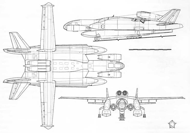 На верхней поверхности крыла между килями помещался блок силовой установки из пяти турбореактивных двигателей НК-10Б и сверхзвукового воздухозаборного устройства.