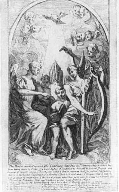Уильям Хогарт не возвысился пока до общения с заказчиками «Золотого ангела». Сидя в мастерской за магазином рядом с дюжиной других подмастерьев, вырезал он на блюдах или чашах узоры, гирлянды, геральдических леопардов, картуши с латинскими девизами. Кое в чем, однако, Гэмбл уже начинал юного Уилли отличать: именно ему было поручено изготовление рекламной карточки заведения. В соответствии с желанием патрона Хогарт вырезал изображение парящего ангела с пальмовой ветвью и надпись (по-английски и — увы, с ошибками — по-французски), сообщающую, что в мастерской изготовляются все виды блюд, колец и разных ювелирных украшений.