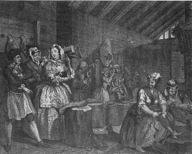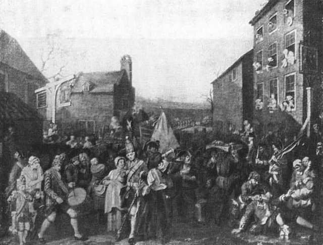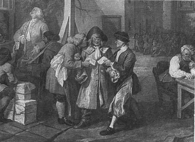 Итак, действительность, добро и зло, жизненная борьба. Сказать, что Хогарт прозревал все эти высокие понятия в явлениях политических, значило бы сильно преувеличить его способность к аналитическому мышлению. Что такое политика для молодого человека, чье поколение не знало ни гражданских войн, ни национальных катастроф, ни тех потрясений, которые выпали на долю Англии в минувшем XVII веке? Политика для него это, наверное, не более, чем пустые и бесконечные споры о вигах и тори, о последнем парламентском билле, о предвыборном скандале в Йоркшире, о речи лорда — хранителя печати в Палате общин. Во всем этом куда меньше драматизма, чем в событиях, происходящих хотя бы на соседней улице.