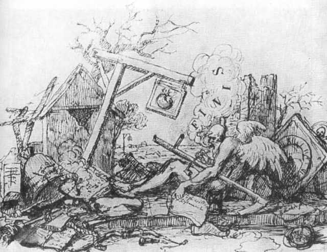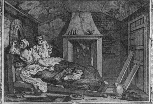 Трагизм хогартовской эпохи был куда менее заметен, нежели бедствия войны времен Калло. И он не мог проявиться прямо, он проглядывал робко и невнятно сквозь анекдоты и назидательные обличения пороков, облекаясь то в тревожную пляску теней и линий, то в гримасу выдуманного чудовища, то в судорожные ритмы теряющей рассудок толпы.