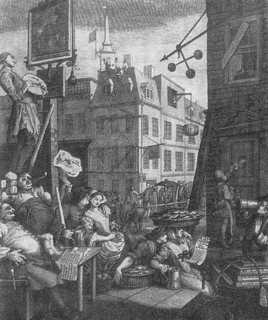 Вот он режет гравюру «Маскарады и оперы», осуждая в праведном гневе дурные вкусы, царящие в искусстве. Его негодование благородно, он издевается над публикой, восхищающейся вульгарными зрелищами, над снобами, что сходят с ума от пения итальянской примадонны Франчески Гуццони, в то время как истинные ценности высокого искусства пребывают в позорном забвении. И чтобы это забвение показать, он рисует книги Конгрива и Шекспира, которые везут на тачке в лавку старьевщика. Все это чистосердечно, зло и даже забавно, но риторично до последней степени. Здесь начисто отсутствуют тревожные и горькие мелодии, что мерещились в «Пузырях Южного моря».