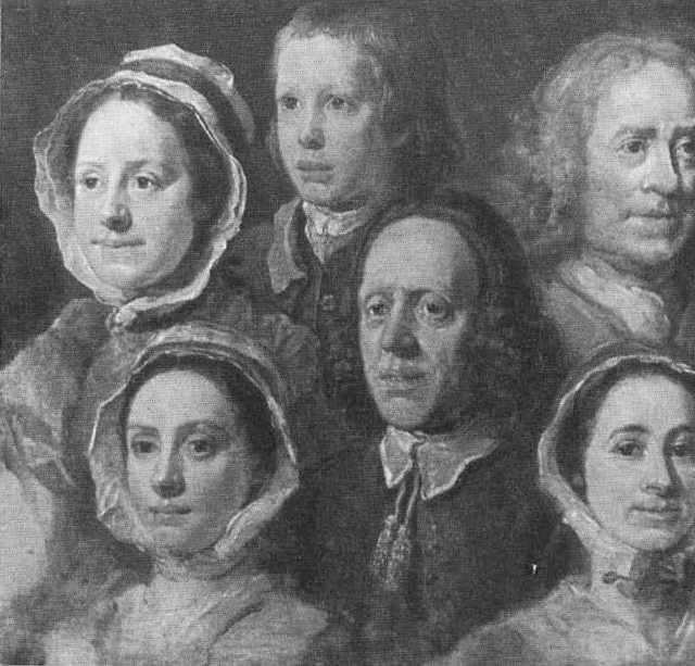 А сам Хогарт? Никто еще не знает, что он вскоре станет знаменитостью, никто не пишет о нем в мемуарах, и уж подавно никто не интересуется тонкостями его душевной жизни. Его лицо на единственном автопортрете тех лет непроницаемо добродушно; ничто в нем не дает ключей к пониманию внутренней жизни художника, так непохожего на своих современников, а временами и на самого себя. Результаты его изощренных наблюдений над мимикой и жестами людей едва ли заметны в тех гравюрах, где, увлекаясь пафосом клеймения пороков, он становится более моралистом, чем художником.