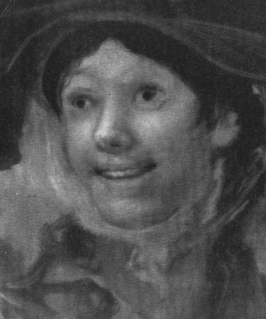 Говорят, правда, что этот холст написан чуть ли не за десять лет до хогартовской смерти, но мнение это основано только на фасонах костюмов. Верить в это не хочется. Слуги Хогарта могли быть консерваторами в вопросах моды, а живопись портрета именно такая, которая была свойственна самым последним работам художника.