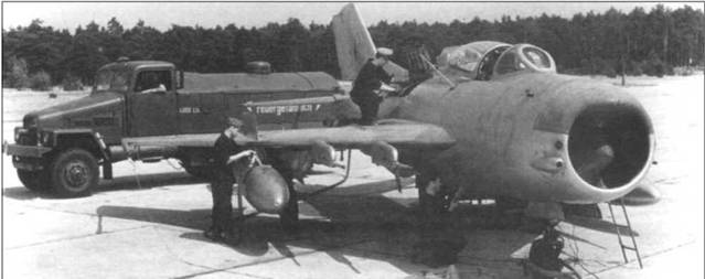 Один из двух восточногерманских МиГ-19С, получивших специальную окраску для показательного выступления на открытии Чемпионата мира по пилотажу. Оба самолета были разбиты во время тренировок и выступление не состоялось.