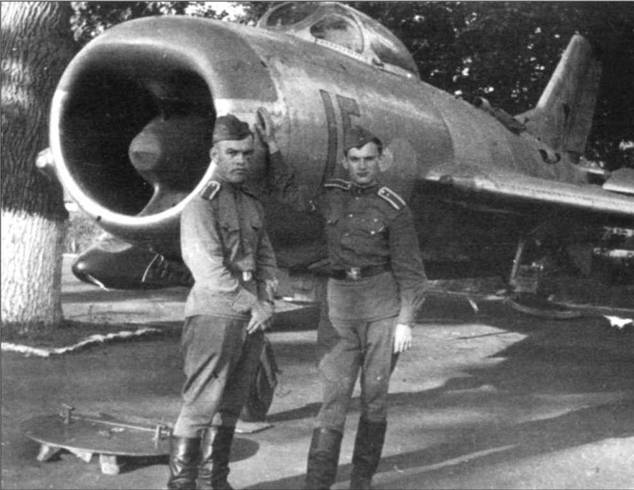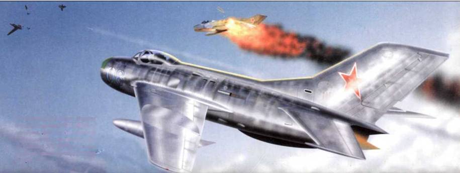 Расположившись на газоне рядом со стоянкой самолетов, северокорейские пилоты обсуждают боевые вылеты. Самолет на заднем плане – F-6 позднего выпуска. Истребители ВВС Северной Кореи имели цвет натурального металла, бортовые номера красного цвета и несли знаки национальной принадлежности в шести позициях.