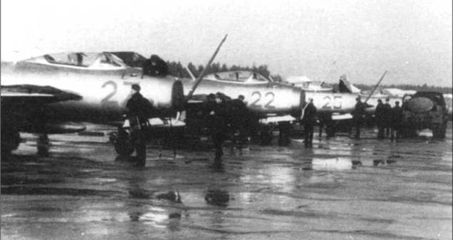 Линейка МиГ-19 на стоянке советской авиабазы. На стоянке носовая штанга поднималась, чтобы избежать травматизма среди персонала и не быть поврежденной аэродромной техникой. Бортовые номера, начинающиеся с 20, указывают, что самолеты принадлежали 2-й эскадрилье, а их синий цвет означает, что часть относится к войскам ПВО. Все МиГ-19 оснащены 760-литровыми подвесными баками.