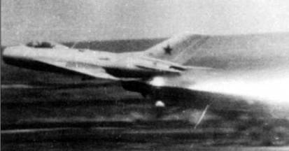 Один из пяти построенных СМ-30 стартует с пусковой установки ПУ-30. Работающие ускорители ПРД-22 оставляют за самолетом облако огня и дыма. Ускорители работали 2,5 секунды, после чего сбрасывались. Они развивали тягу в пять раз превышавшую взлетный вес самолета.