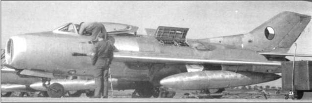МиГ-19 «26 синий» на советском аэродроме. Бортовой номер имеет тонкую черную окантовку. МиГ-19 отличался от прототипов СМ-9 перепроектированной сдвижной частью фонаря без переплета. Кроме того, на опытных самолетах не было приемника ПВД на правом борту, как на серийных машинах (на снимке виден прямо над бортовым номером).