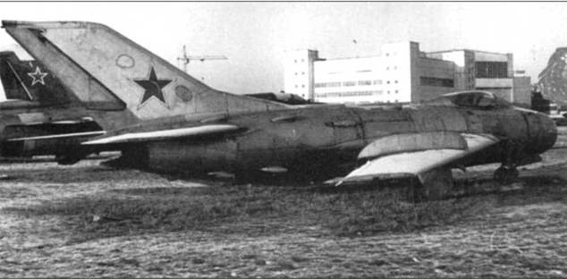 МиГ-19 и пара Су-7БМ на стоянке школы технических специалистов. Сдвижная часть фонаря с «08» снята. Как было принято в то время, самолет несет звезды на верхней поверхности крыла.