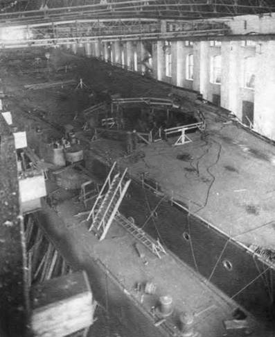 Линейный корабль “Полтава" на стапеле: набор верхней палубы (вверху) и кормовая оконечность правого борта 25 июня 1911 г