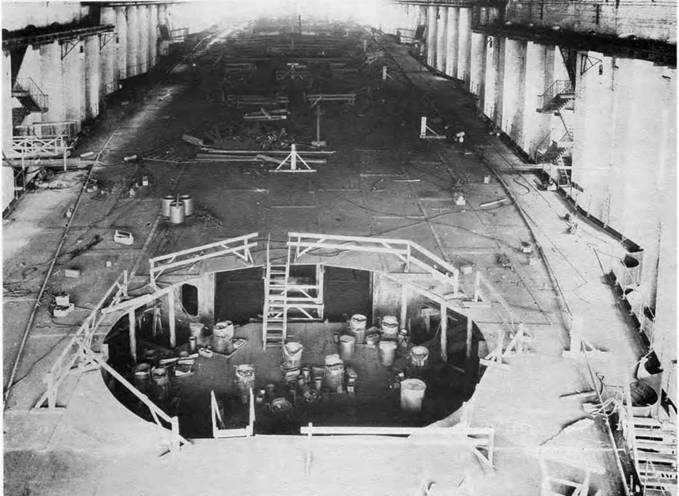 Линейный корабль “Полтава” на стапеле: набор днища 1 февраля 1910 г. (вверху) и набор карапасной палубы 11 октября 1910 г.