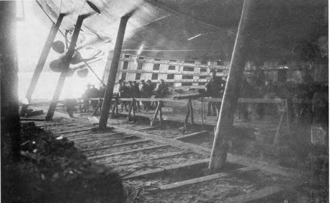 Линейный корабль “Полтава” на стапеле: настилка средней палубы и набор верхней палуб 4 апреля 1911 г. (вверху) и настилка верхней палубы 25 июня 1911 г.