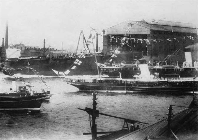 На фото вверху: “Гангут” покидает Адмиралтейский завод. 27 июня 1914 г. •На фото справа: “Гангут” в Неве. 6 июля 1914 г.