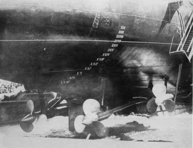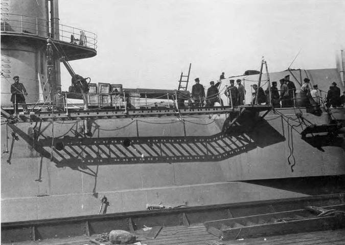 В частности, па "Орле" в ходе Цусимского сражения эту воду (около 200 т) удалось спустить в трюм, а затем в кочегарку, оттуда ее откачали помпами. Это явилось одной из причин того, что броненосцу "Орел", получившему крен 5°, удалось избежать опрокидывания.