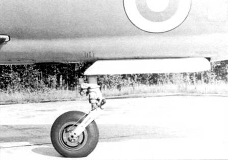 На треугольном крыле второго прототипа Е-4/2 были установлены вертикальные перегородки, уменьшающие боковую составляющую воздушного потока, обтекавшего крыло. Между второй и третьей перегородками виден «солдатик» – механический индикатор выпущенного положения основных опор шасси.