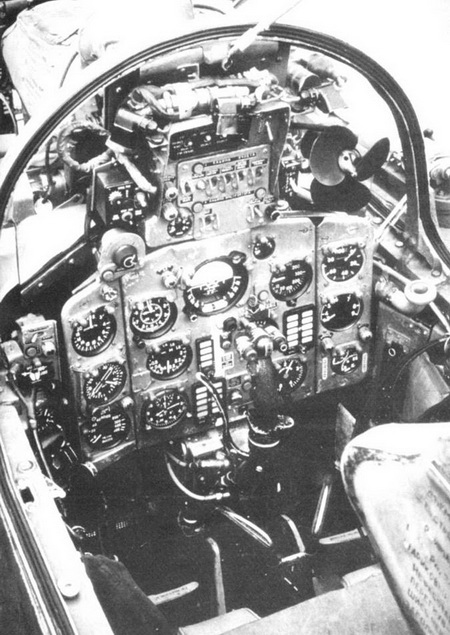 Задняя, инструкторская, кабина самолета МиГ-21УМ. Все надписи выполнены на русском языке. Обратите внимание на вентилятор, закрепленный в правой верхней части приборной доски. Таким вентиляторами оборудовались кабины советских транспортных самолетов и вертолетов.