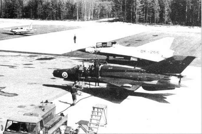 Три финских самолета на стоянке испытательного центра ВВС Финляндии, май 1979 г. На переднем плане – МиГ-21УМ за ним – SAAB J-35CS «Дракен», слева – самолет первоначального обучения Валмет «Винка».
