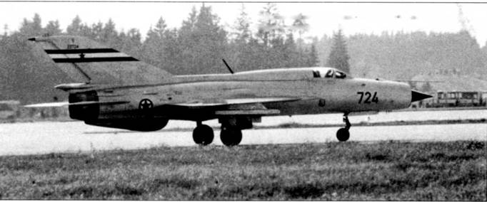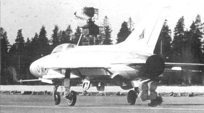 Истребители МиГ-21 эспортировались в Финляндию под обозначением МиГ-21Ф-12, хотя были идентичны стандартным МиГ-21 Ф-13, которые состояли на вооружении ВВС СССР. Этот финский МиГ-21Ф-12 взлетает с аэродрома Халли, май 1974 г. Caмoлет принадлежит 310й истребительной эскадрилье ВВС Финляндии.