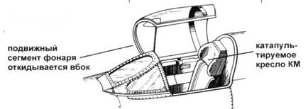 Фонарь истребителя МиГ-21Ф-13 откидывался вперед на петлях. При катапультировании фонарь закрывал летчика от скоростного напора воздуха.