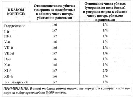 Отношение числа убитых к числу раненых не должно сильно разниться в однородных войсках для крупных войсковых единиц, если означенные числа будут собраны за такой продолжительный период времени, как целая кампания, ибо такое отношение должно более всего зависеть от свойств оружия противника и от того, какая рана для человека является смертельной и какая нет. Оба последних условия могут быть признаны для одной и той же кампании почти неизменными; влияние же удачной перевязки на поле битвы парализуется множеством случаев поражений, приходившихся на каждый корпус; несомненно, в каждом из последних были случаи и более и менее благоприятные для выздоровления, так что в общем результате влияние перевязки могло сделаться ничтожным.