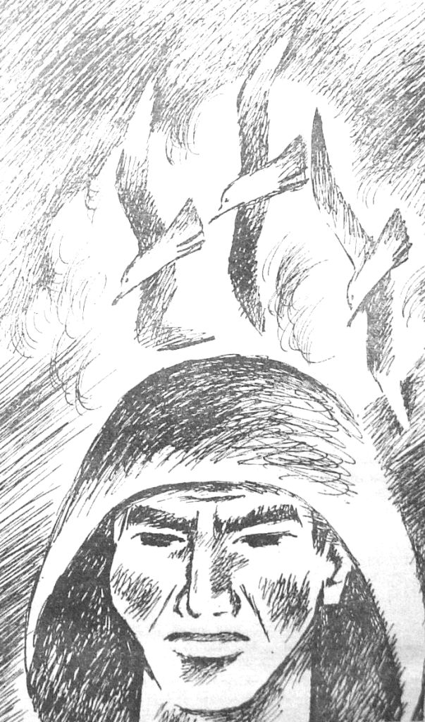 Вот один из них сидит рядом со мной. Вернее, это я нахожусь у него в гостях, в его лачуге. Он очень стар. Согнулся весь под тяжестью долголетней нелегкой рыбацкой жизни. Голова, усы и борода его белы. Ресницы, брови — тоже. Сидит с нами у очага, подбрасывает в тлеющий огонь сухой хворост, не забывая при этом то и дело отгонять тяжелыми, бессильно повисшими руками налетавших на огонь бабочек.