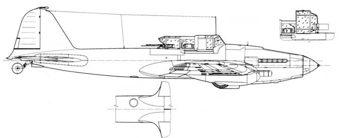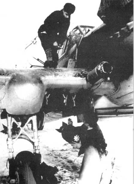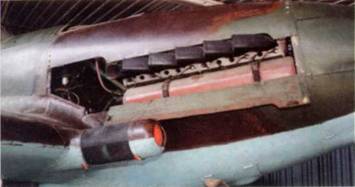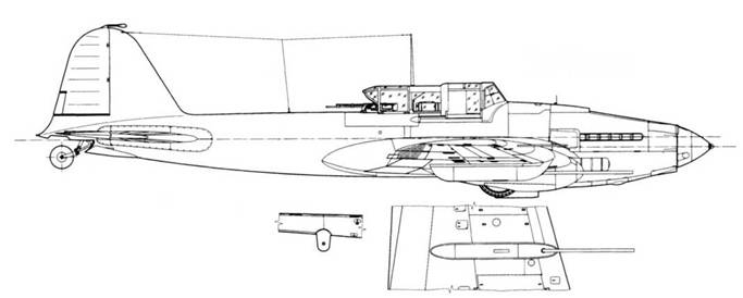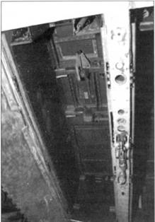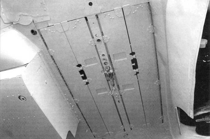Общий вид нижней части центроплана с бомбоотсеками и бронекорзиной маслорадиатора. Последняя была сделана из 6-мм брони и имела спереди двухсекционную заслонку, в то время как верхняя заслонка с задней стороны регулировала расход воздуха через радиатор системы охлаждения. Передние бронезаслонки были закрыты при рулежке но земле, вплоть до момента уборки шасси, или могли быть закрыты в полете, при атаке наземной цели.