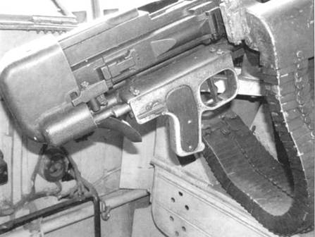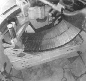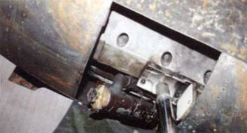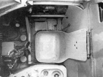 Бронированная перегородка из двух 12-мм пластин, защищавшая бензобак сзади. На верхней пластине виден лючок, через который осуществлялась заправка. Также на фотографии виден узел крепления фиксатора фонаря стрелка в открытом положении.