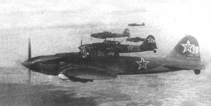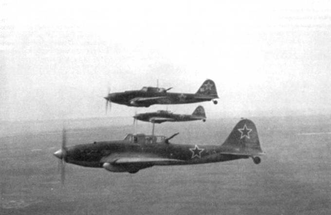 Снимки, сделанные во время боевого вылета являются крайне редкими. Тройка штурмовиков следует на задание. Самолеты на переднем плане несут бортовые номера «53» и «16», причем у последнего кок винта окрашен в светлый цвет (вероятно желтый).