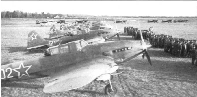 Парадный строй штурмовиков 281-ой шад 14-ой Воздушной Армии Ленинградского фронта на аэродроме Тарту, октябрь 1944 года. Самолет на переднем плане имеет двойной бортовой номер («66/17 белый»), эмблему в виде красного сердца на киле и окрашенный в светлый цвет кок винта. За ним стоят самолеты с бортовыми номерами «11», «81» и «12» белого цвета. Па заднем плане видны бипланы Поликарпов У-2.