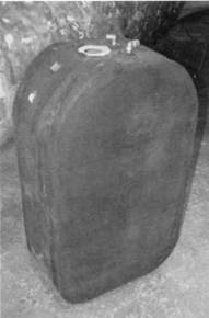 Слева: задний топливный бак емкостью 305 литров, извлеченный из своего отсека. Бак покрыт защитным материалом черного цвета.