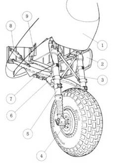 Правая стойка шасси: 1 – обтекатель, 2 – створка, 3 – поперечная связь, 4 – буксировочное ушко, 5 – амортизационная стойка, 6 – складывающийся подкос, 7- цилиндр фиксатора, (V – цилиндр уборки/выпуска шасси, 9 – рычаг управления створками.