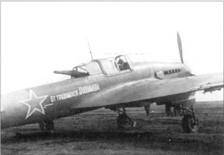 Трудовой порыв рабочих, национальная гордость и патриотизм часто находили отражение в виде надписей на борту самолетов. Много самолетов было построено на добровольные сборы и пожертвования, что также нашло отражение в соответствующих дарственных надписях, как на этом Ил-2 Тип 3 – «От трудящихся г. Куйбышева». Обратите внимание на пустые пусковые реактивных снарядов с хорошо различимым пусковым механизмом.